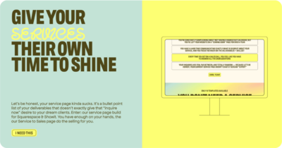 Stop flogging your services like stale bread and start giving them a moment to shine & sell with a page that takes people through just how freaking massive the transformation of your service is (no bullet points included). Build for creative entrepreneurs, by a creative entrepreneur, it’s got everything you need make your service shine online.